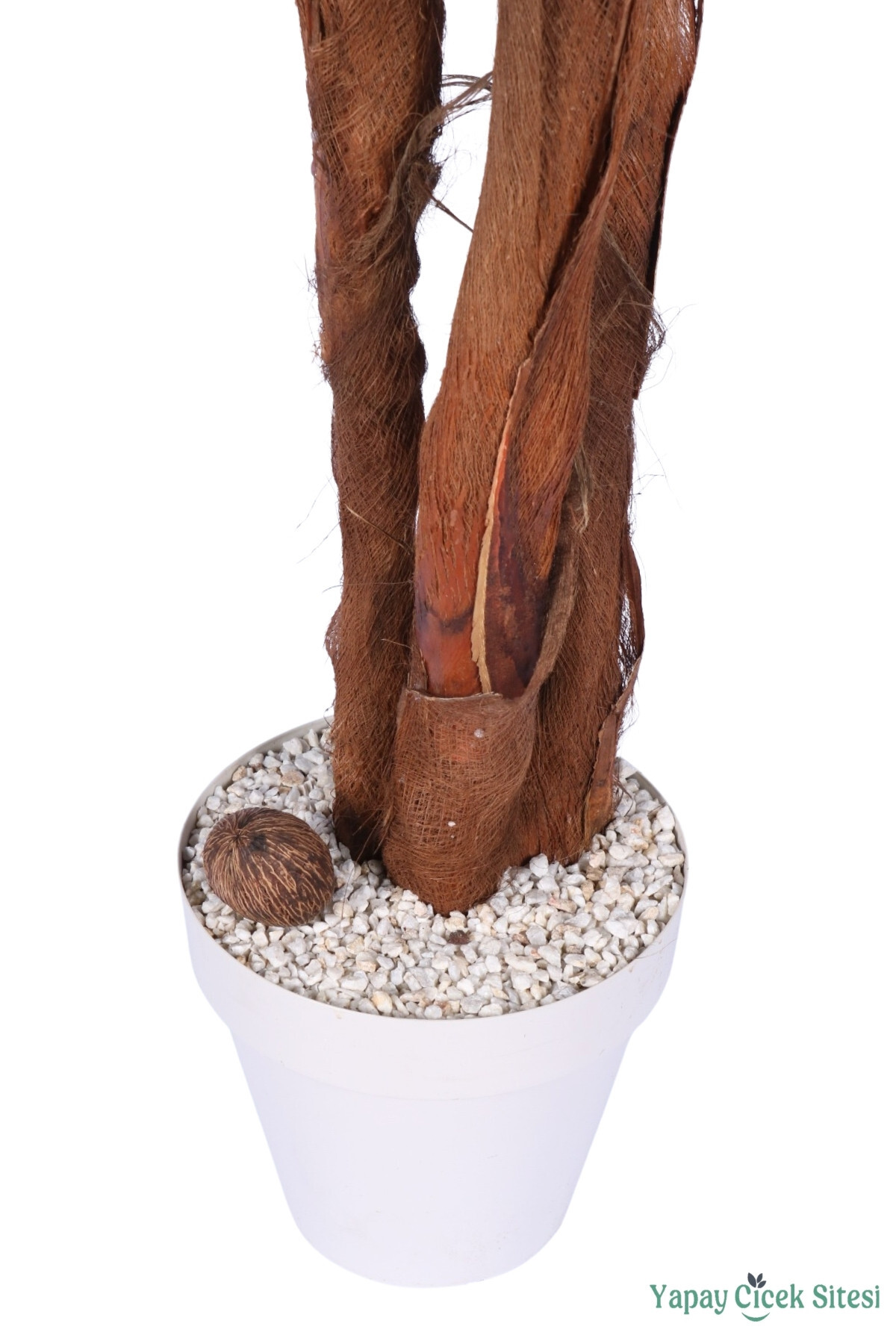 Doğal Zemin Detayı: Saksı yüzeyi beyaz küçük taşlar ve dekoratif bir Hindistan cevizi detayı ile süslenmiştir.