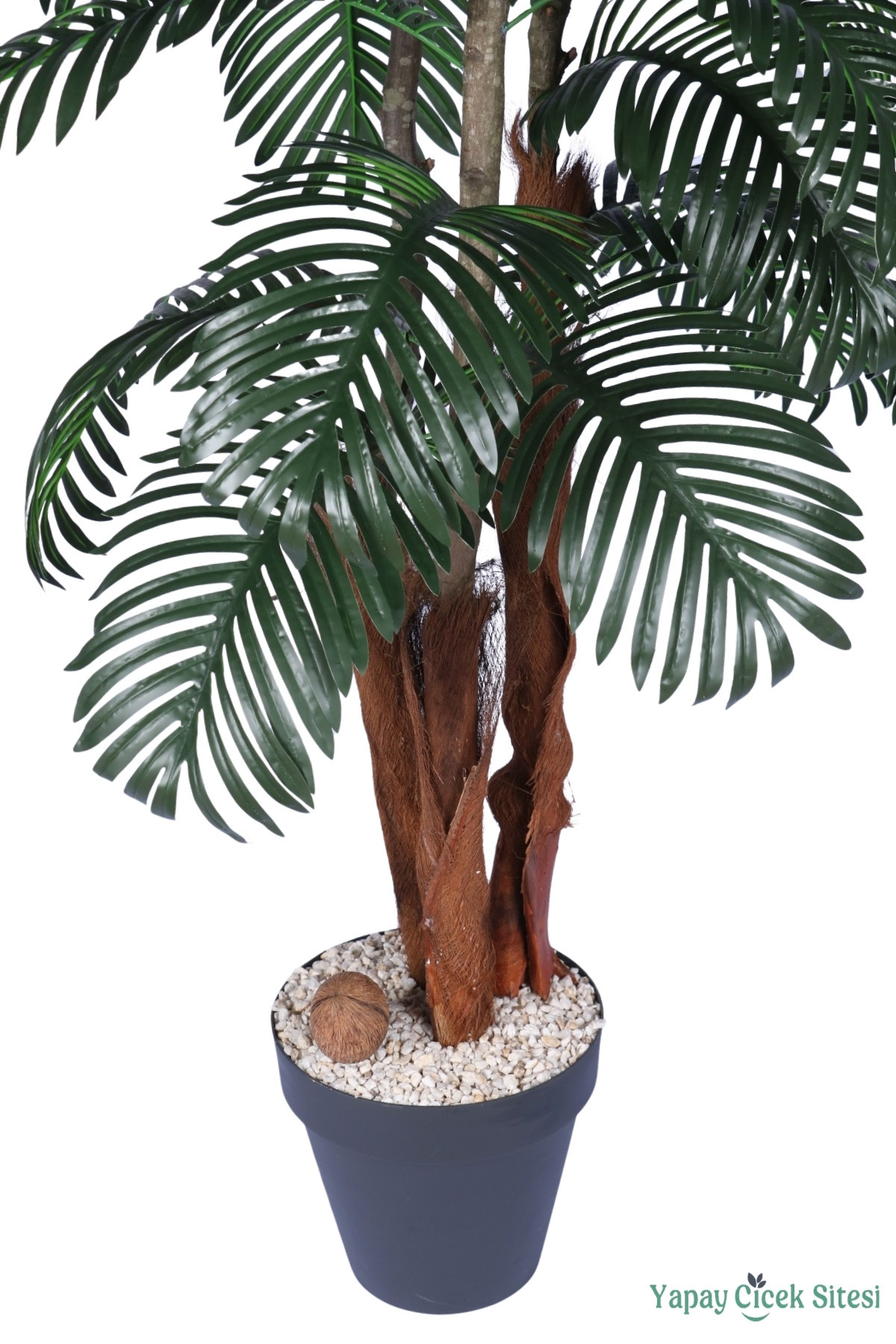 Doğal Zemin Detayı: Saksı yüzeyi beyaz küçük taşlar ve dekoratif bir Hindistan cevizi detayı ile süslenmiştir.