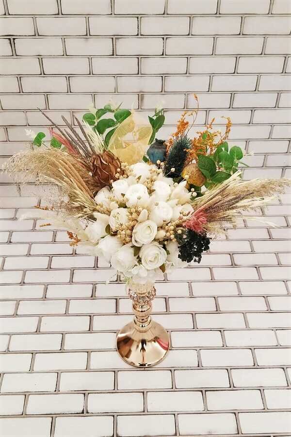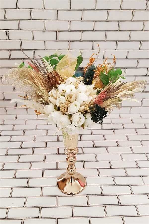 Siparişleriniz aynı gün içinde kargoya verilir. Alfa Beyaz Gül ve Kuru Çiçek Şöleni Dekor Kız İsteme Hediyelik Aranjman Beyaz Yeşil stoklarımızda bulunmaktadır. kız isteme, hediyelik, dekoratif süs, dekoratif vazo, dekor, dekoratif aranjman, metal saksılı çiçek,