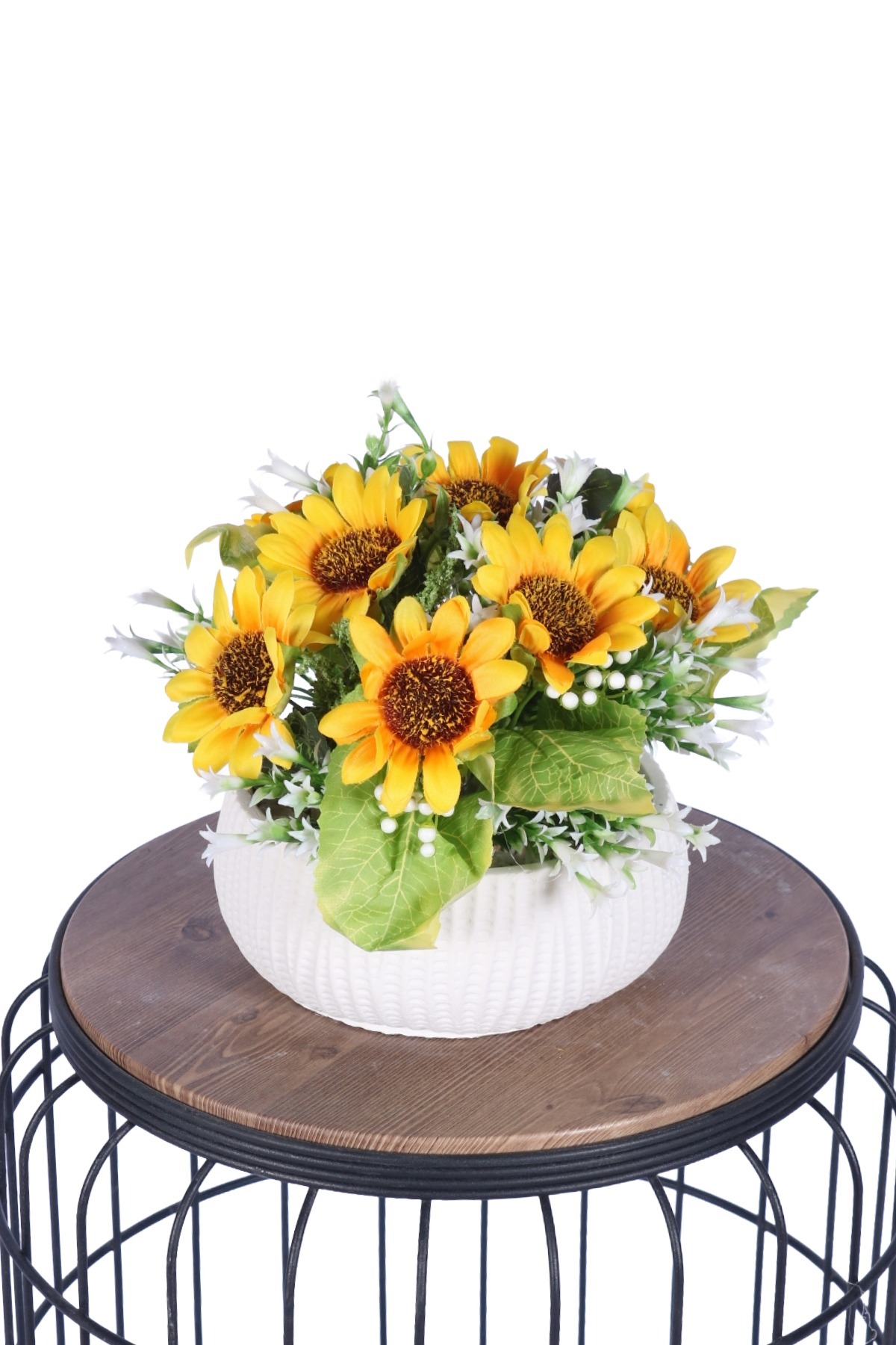 Canlı ayçiçekleri ve zarif papatyaların uyumuyla hazırlanan bu yapay çiçek tanzimi, bulunduğu ortama sıcak ve enerjik bir hava katar. Gerçeğe yakın görünümü sayesinde bakım gerektirmeden uzun süre ilk günkü şıklığını korur. Modern ve sade saksı tasarımı ile salon, ofis, masa ve raf dekorasyonu için ideal bir tercihtir.