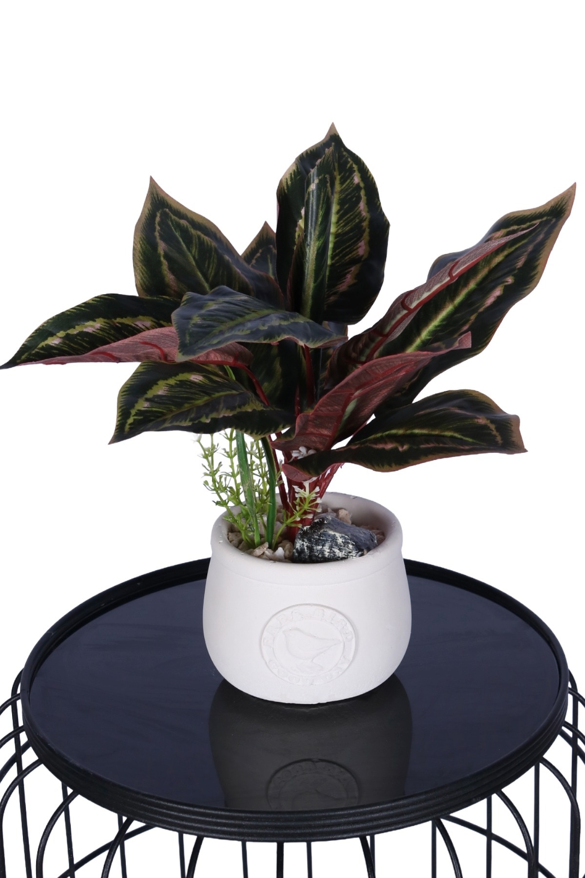 Doğal Aranjman Detayları: Saksı içerisinde kullanılan beyaz çakıl taşları, dekoratif kaya parçası ve ana bitkiyi destekleyen ince yapraklı küçük yeşillik, minyatür bir bahçe görünümü sunar.