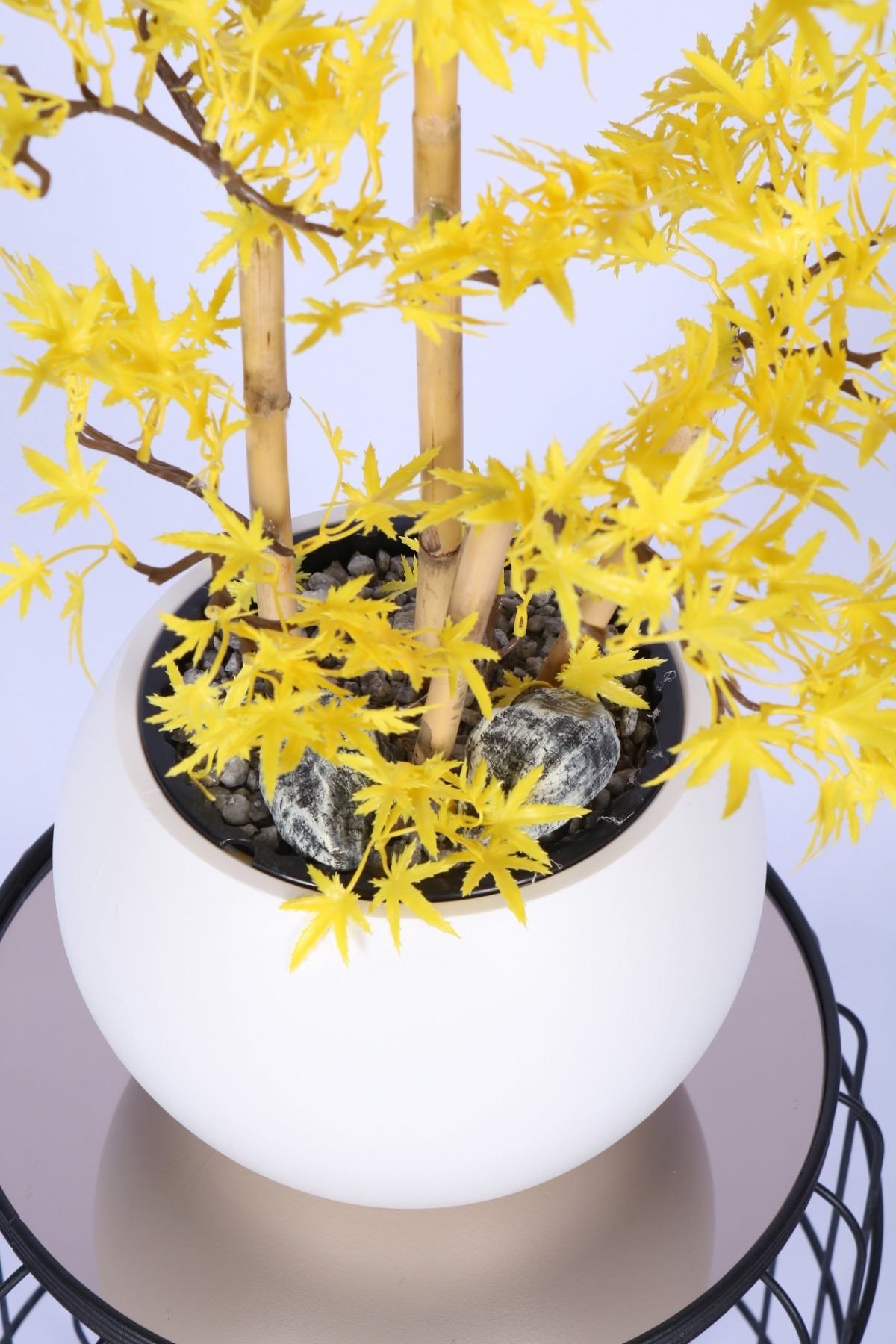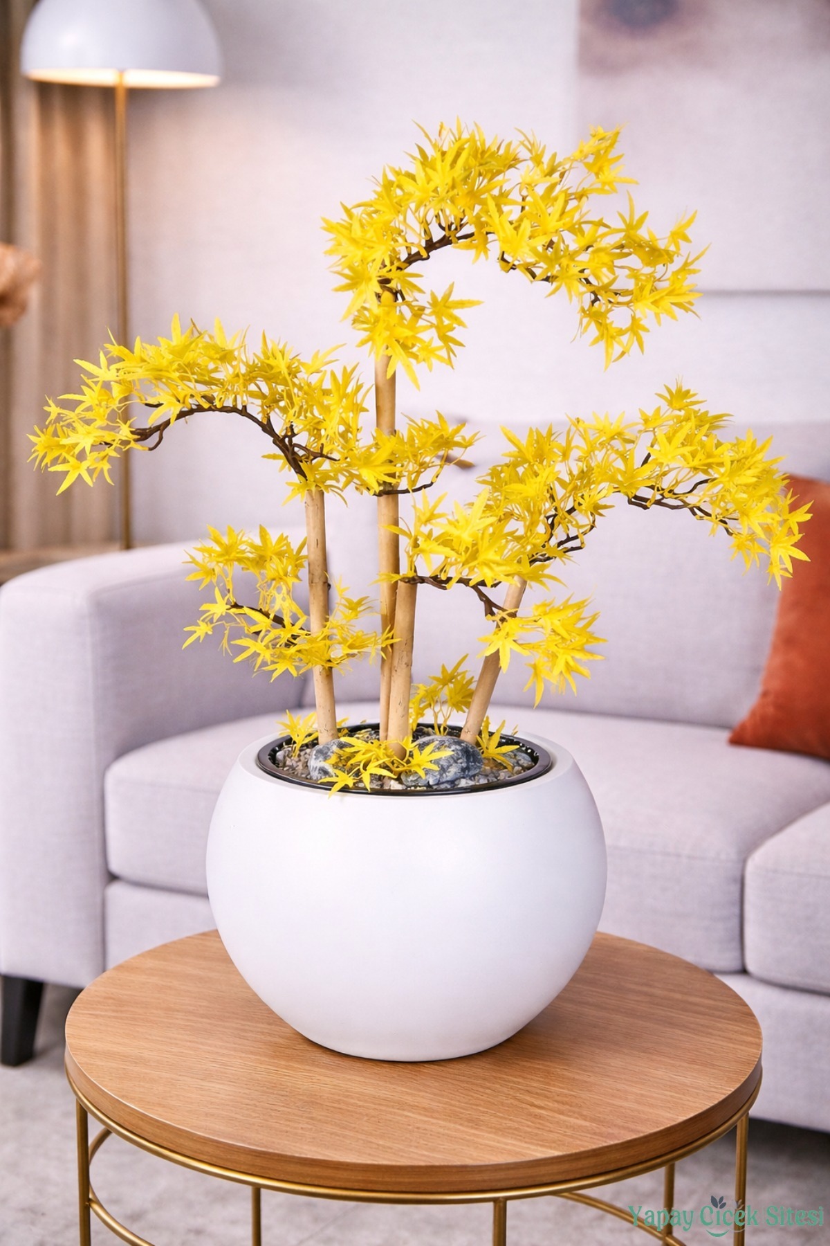 Beyaz Küre Saksıda Modern Minimal Tasarım Yapay Bonsai Ağacı Sarı 65 cm