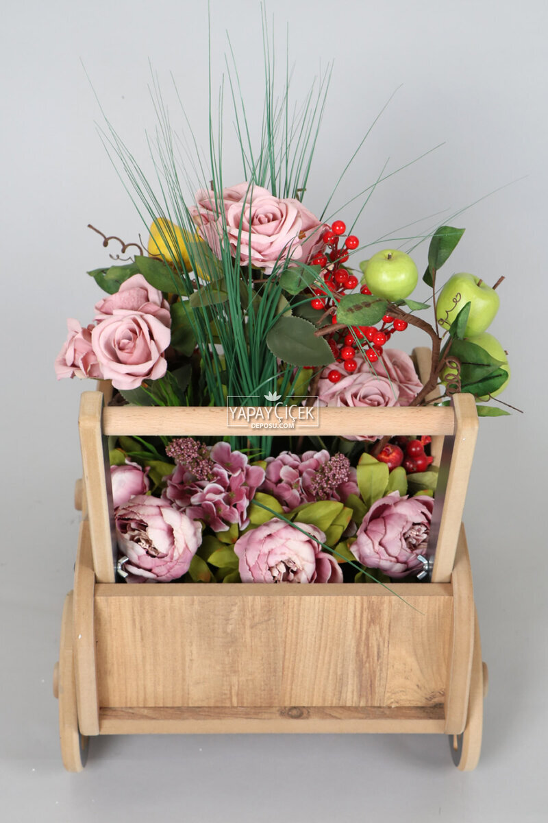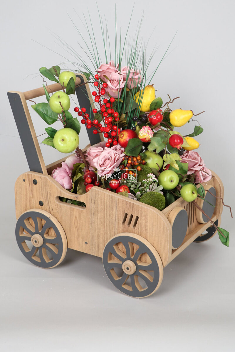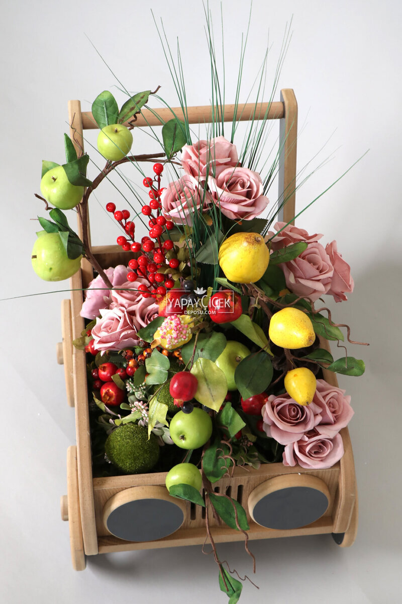 Yapay Aranjman üzerinde 1. kalite yapay çiçekler,bitkiler, yapay meyveler, ithal kuru çiçekler ve yeşillik sazlar mevcuttur. Dekoratif araba 1.kalite mdf lam malzemeden üretilmiştir. Tüm çiçekler araba içerisine sabitlenmiş olup, dökülme düşme yapmaz.