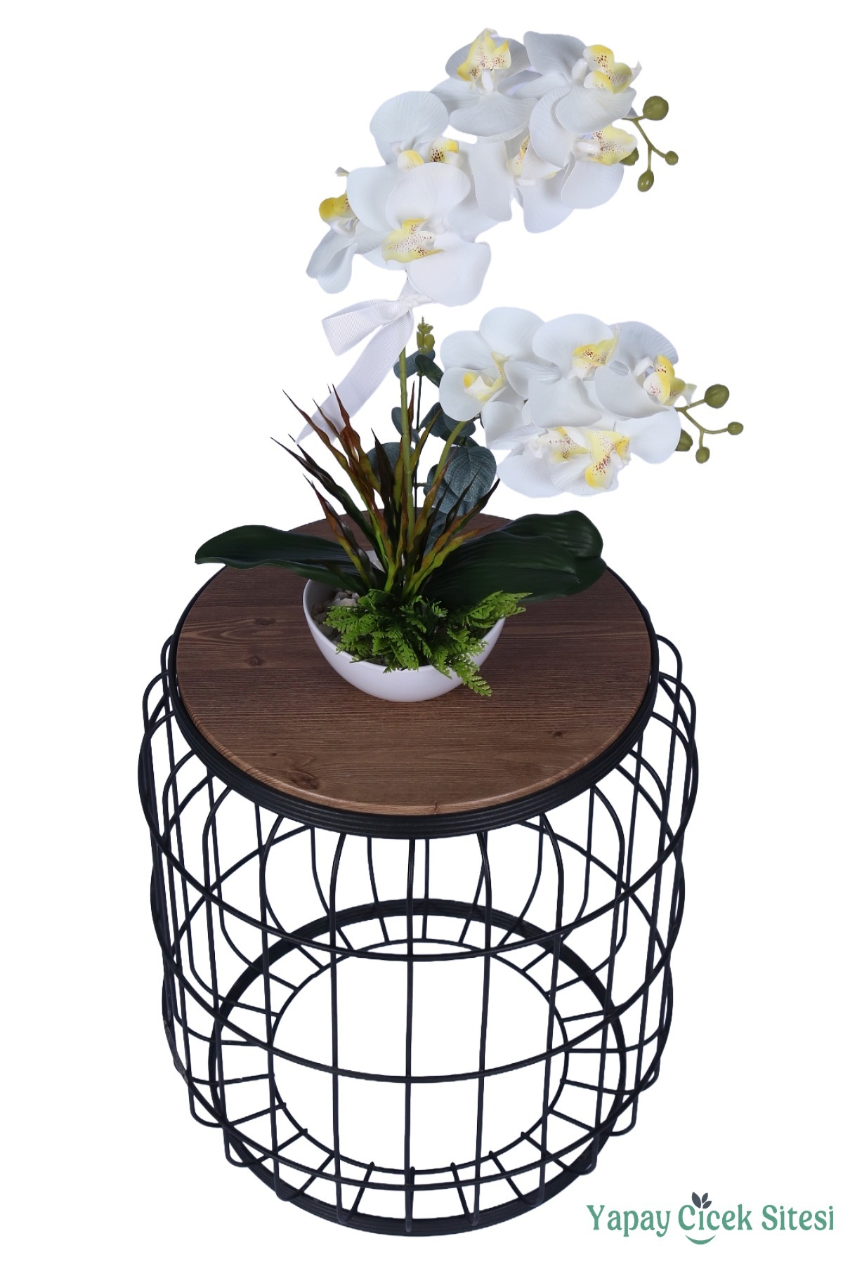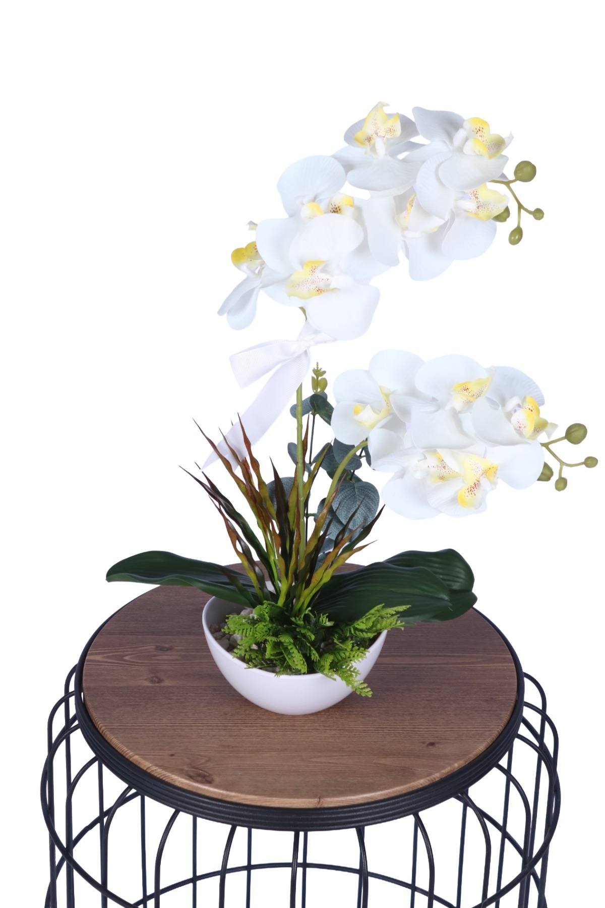 Dekoratif Melamin Saksıda Bol Yeşillikli Orkide Tanzimi Beyaz