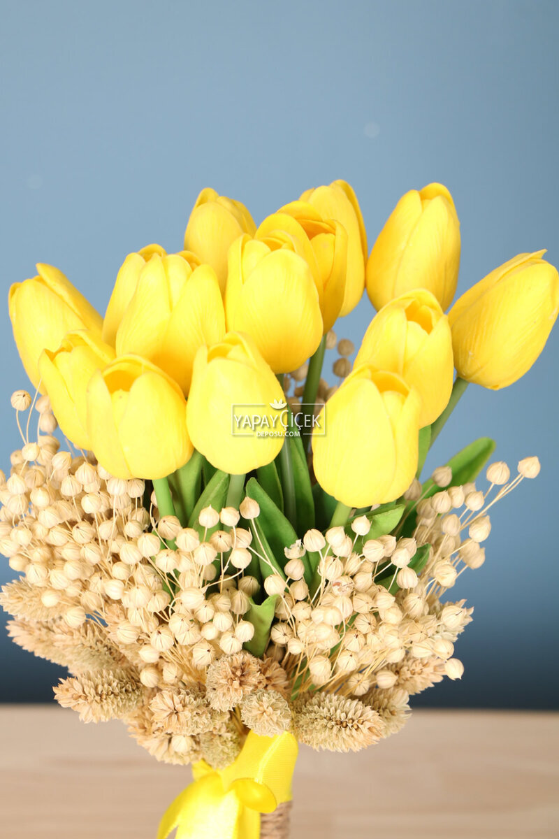 Çiçek İçeriği: buketde 15 damat çiçeğinde 1 adet yapay kaliteli ıslak lale, palaris kuş otu , keten luna otu bulunmaktadır.