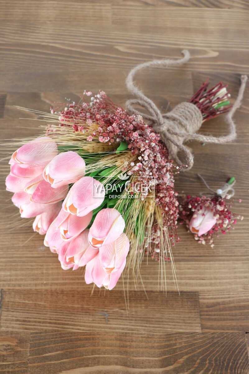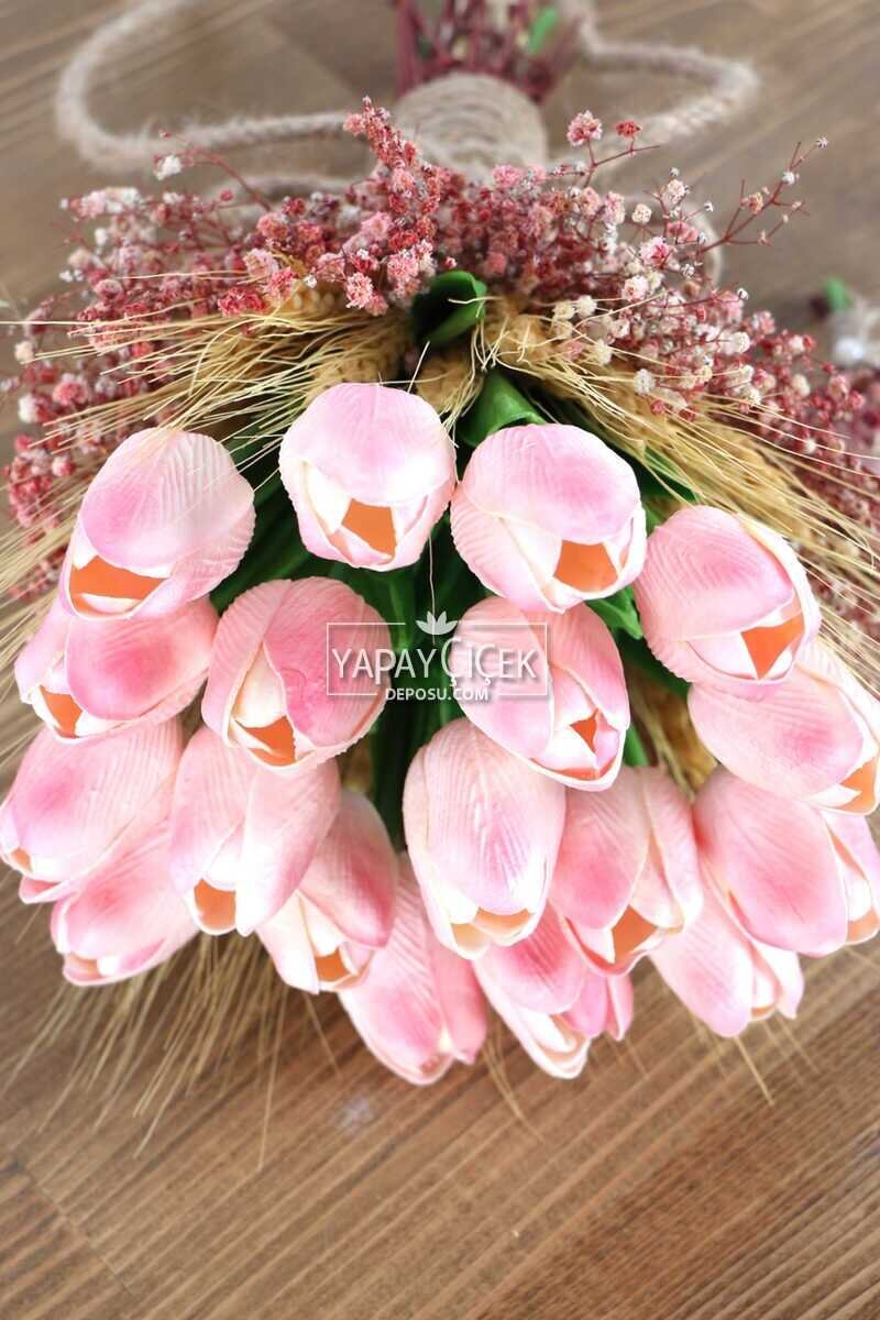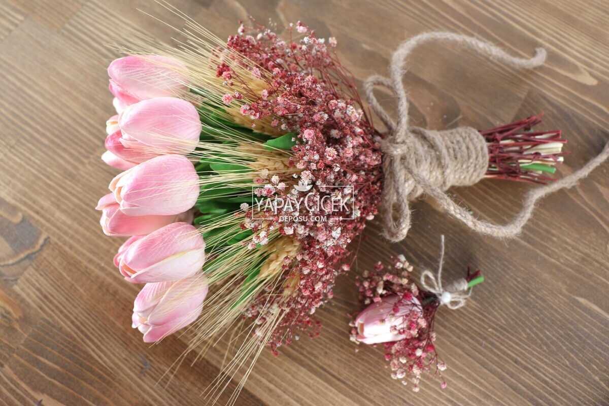 Maine Gelin Buketi Islak Lale Cipso 2li Set; ağırlıklı olarak real touch pembe yapay ıslak lalelerden oluşur.