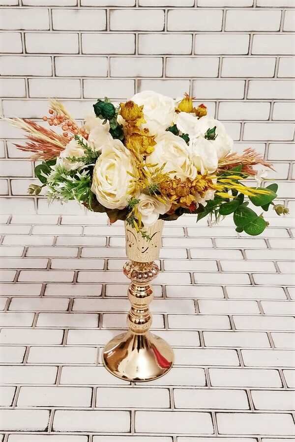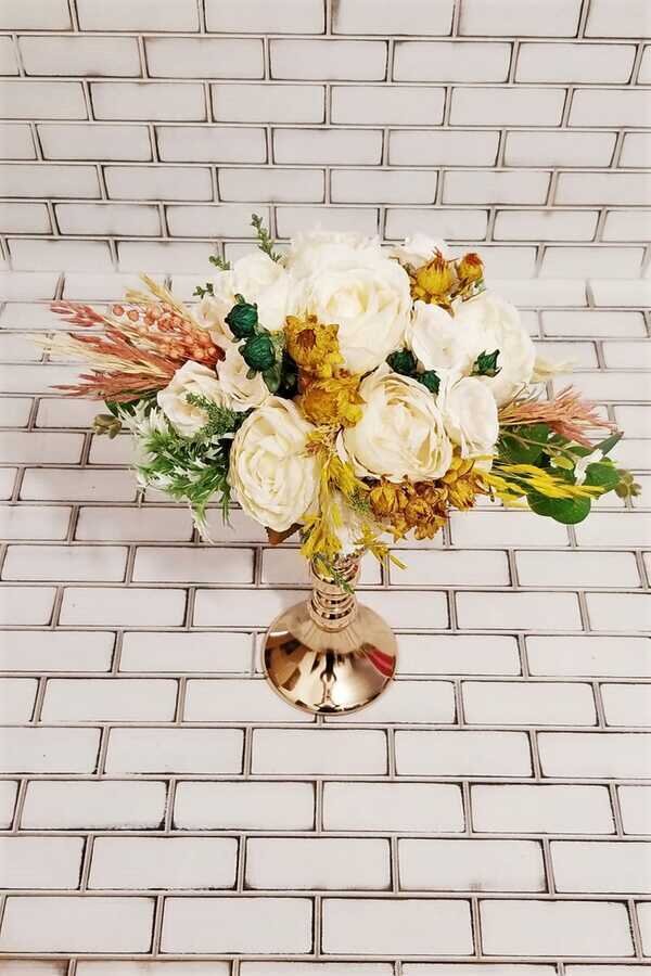 Merlin Beyaz Şakayık Güller ve Kuru Çiçek Şöleni Dekor Kız İsteme Hediyelik Aranjman Beyaz Sarı, el işçiliği ile metal vazo zemin üzerine çiçekler ve ara dal yeşiller yeşillikler tanzim edilerek üretilmiştir. Merlin Beyaz Şakayık Güller ve Kuru Çiçek Şöleni Dekor Kız İsteme Hediyelik Aranjman Beyaz Sarı, modelin üzeri tamamı kaliteli çiçeklerle kaplanmıştır. Lütfen üzerinde birkaç çiçek bulunan ucuz aranjmanlar mukayese etmeyiniz. Vazo üzerinde kullanılan çiçekler 1. Kalite çiçeklerden oluşmaktadır. Vazo üzerinde bulunan çiçekler ve yeşillikler yapay olduğundan çok uzun ömürlüdür en küçük dağılma yada bozulma olmaz. Bu sebepten temizliği de çok kolaydır.