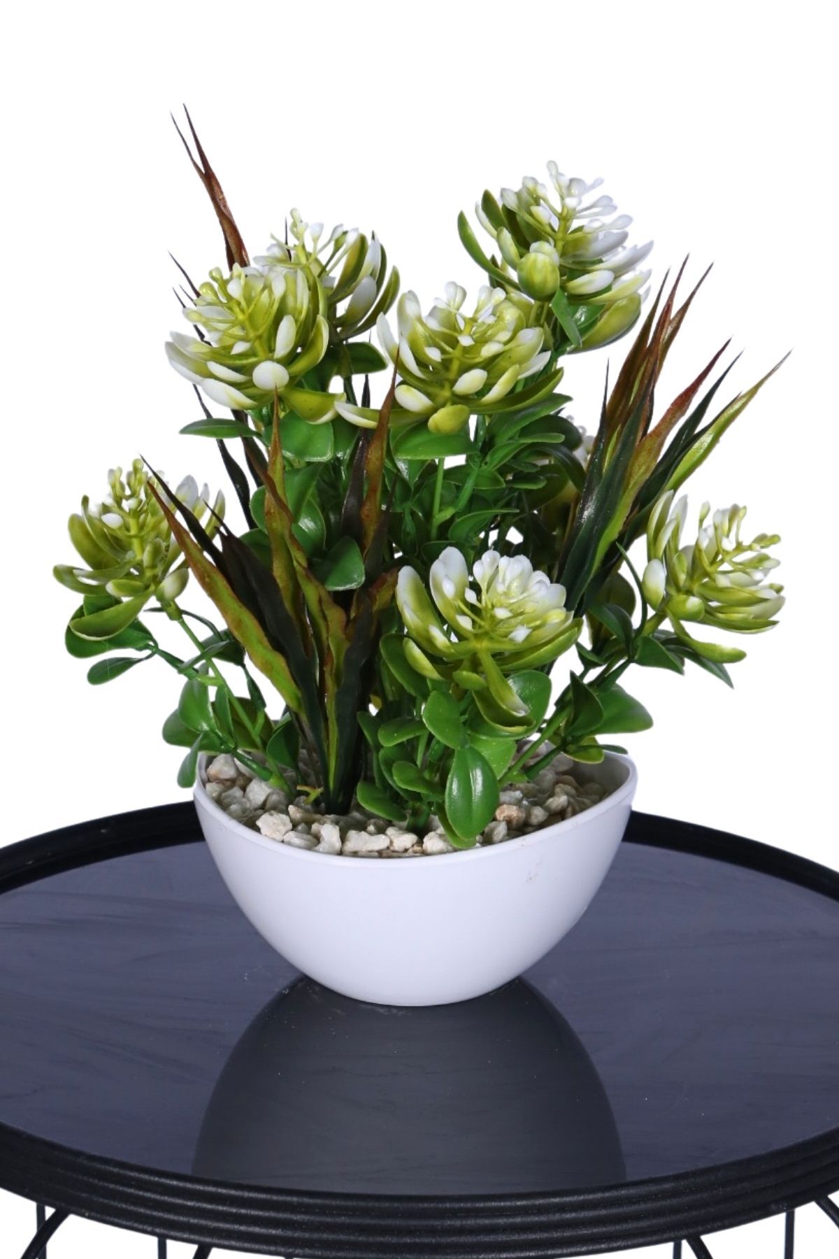 Dekoratif Taş Detayı: Bitkilerin dibinde yer alan doğal görünümlü beyaz çakıl taşları, ürüne "yeni dikilmiş" bir bahçe havası katar.