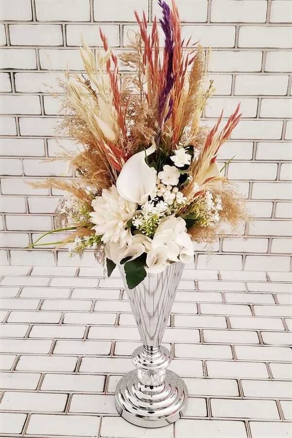 Neda Beyaz Kasımpatı Gala Ortanca Kuru Çiçek Şöleni Dekor Kız İsteme Hediyelik Aranjman Beyaz Bej, el işçiliği ile metal vazo zemin üzerine çiçekler ve ara dal yeşiller yeşillikler tanzim edilerek üretilmiştir. Neda Beyaz Kasımpatı Gala Ortanca Kuru Çiçek Şöleni Dekor Kız İsteme Hediyelik Aranjman Beyaz Bej, modelin üzeri tamamı kaliteli çiçeklerle kaplanmıştır. Lütfen üzerinde birkaç çiçek bulunan ucuz aranjmanlar mukayese etmeyiniz. Vazo üzerinde kullanılan çiçekler 1. Kalite çiçeklerden oluşmaktadır. Vazo üzerinde bulunan çiçekler ve yeşillikler yapay olduğundan çok uzun ömürlüdür en küçük dağılma yada bozulma olmaz. Bu sebepten temizliği de çok kolaydır.