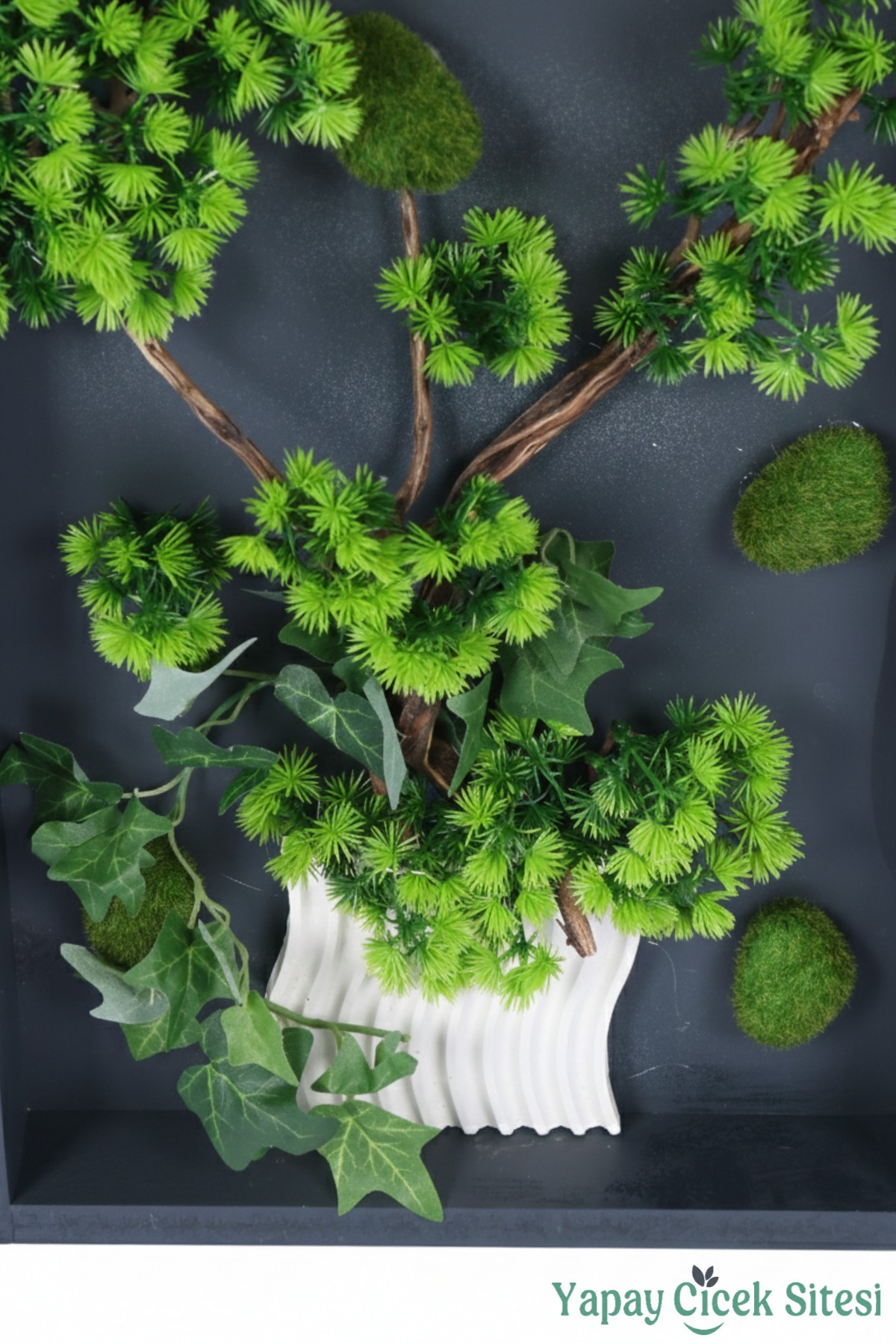Siyah dokulu zemin üzerine hayat bulan canlı yeşil ağaç figürleri, doğal taş detayları ve özel tasarım saksı formuyla her türlü iç mekanda odak noktası haline gelir.var Tablosu El Yapımı 35x55 cm