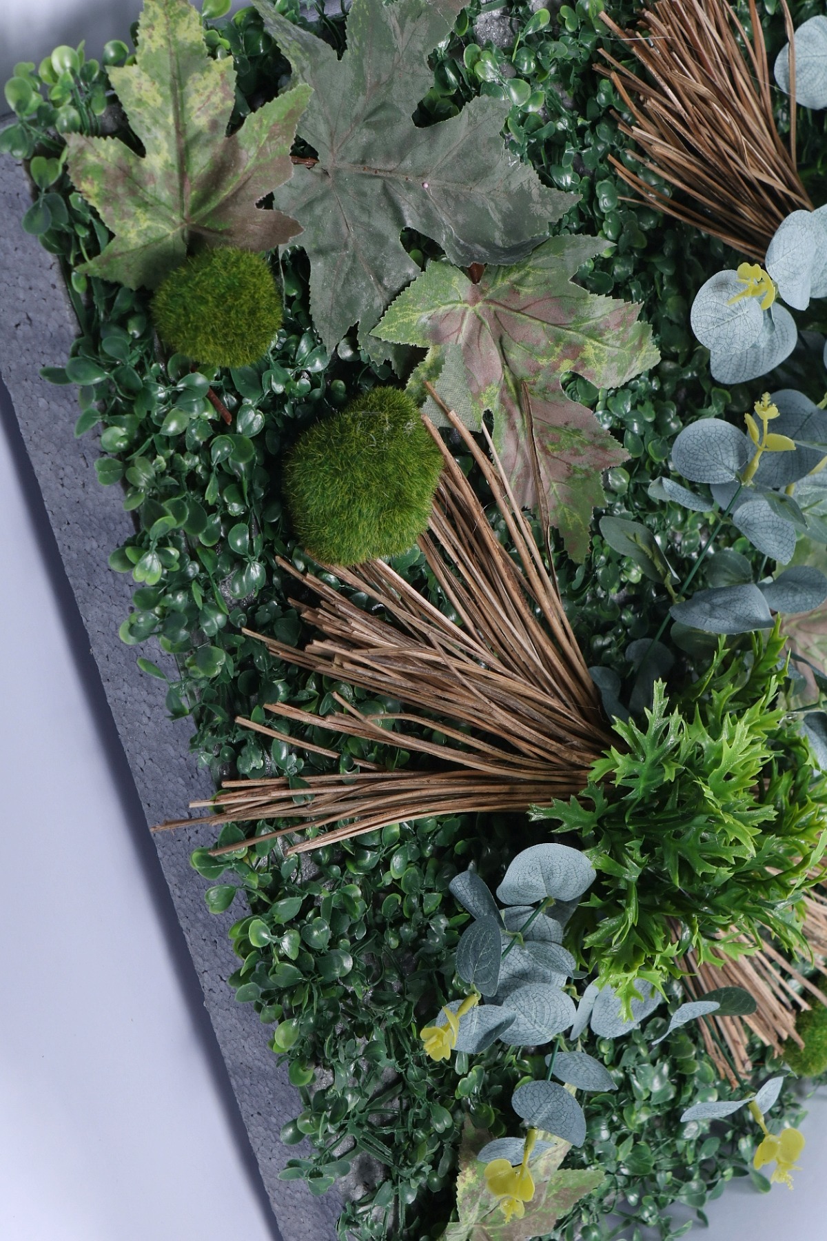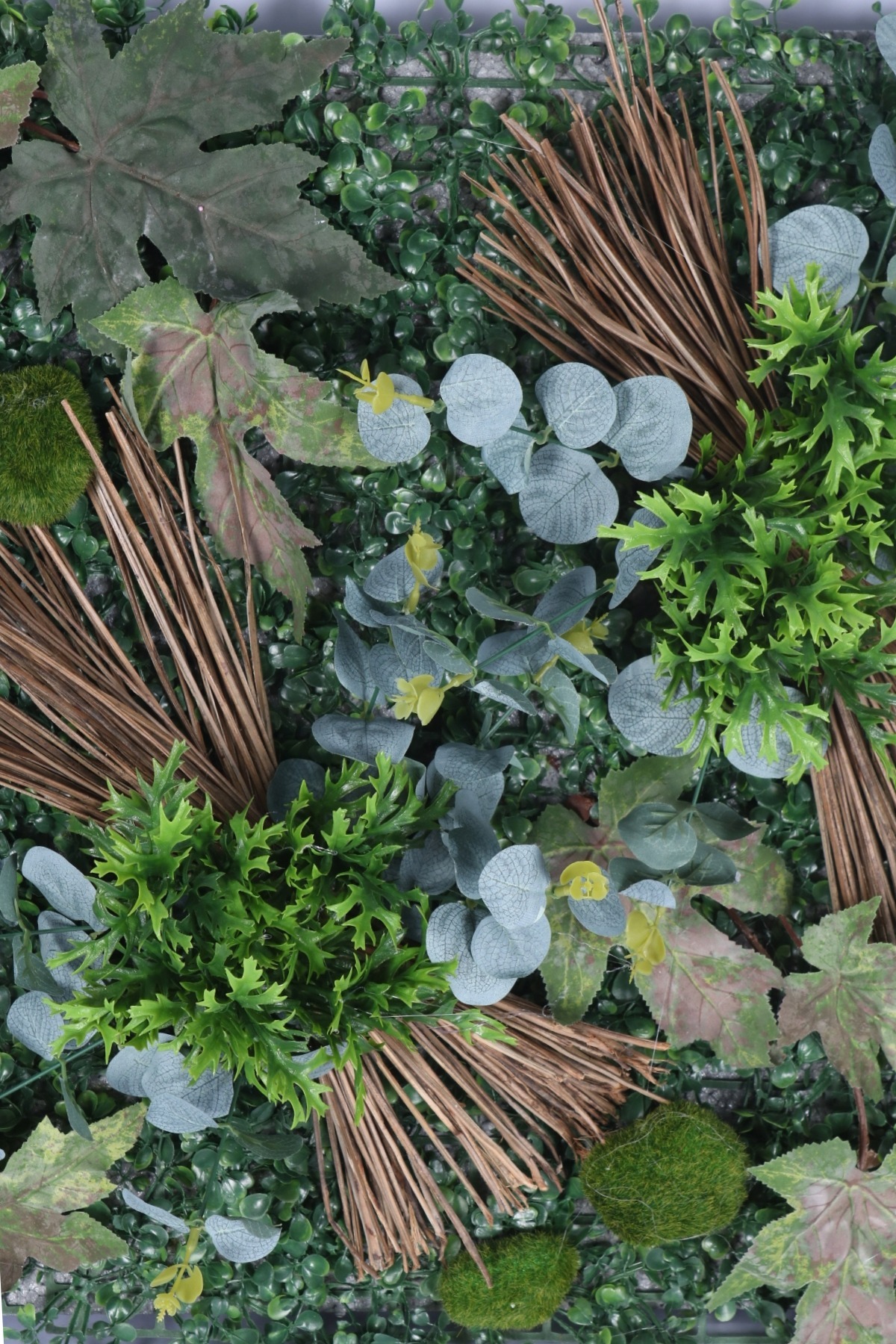 • Zengin ve Katmanlı Görünüm: 3 cm kalınlığındaki dayanıklı EPS strafor köpük üzerine titizlikle sabitlenen bitkiler, toplamda 10 cm'lik bir derinlik oluşturur. Bu hacimli yapı, sıradan düz panellere göre çok daha gerçekçi ve premium bir görünüm sunar.