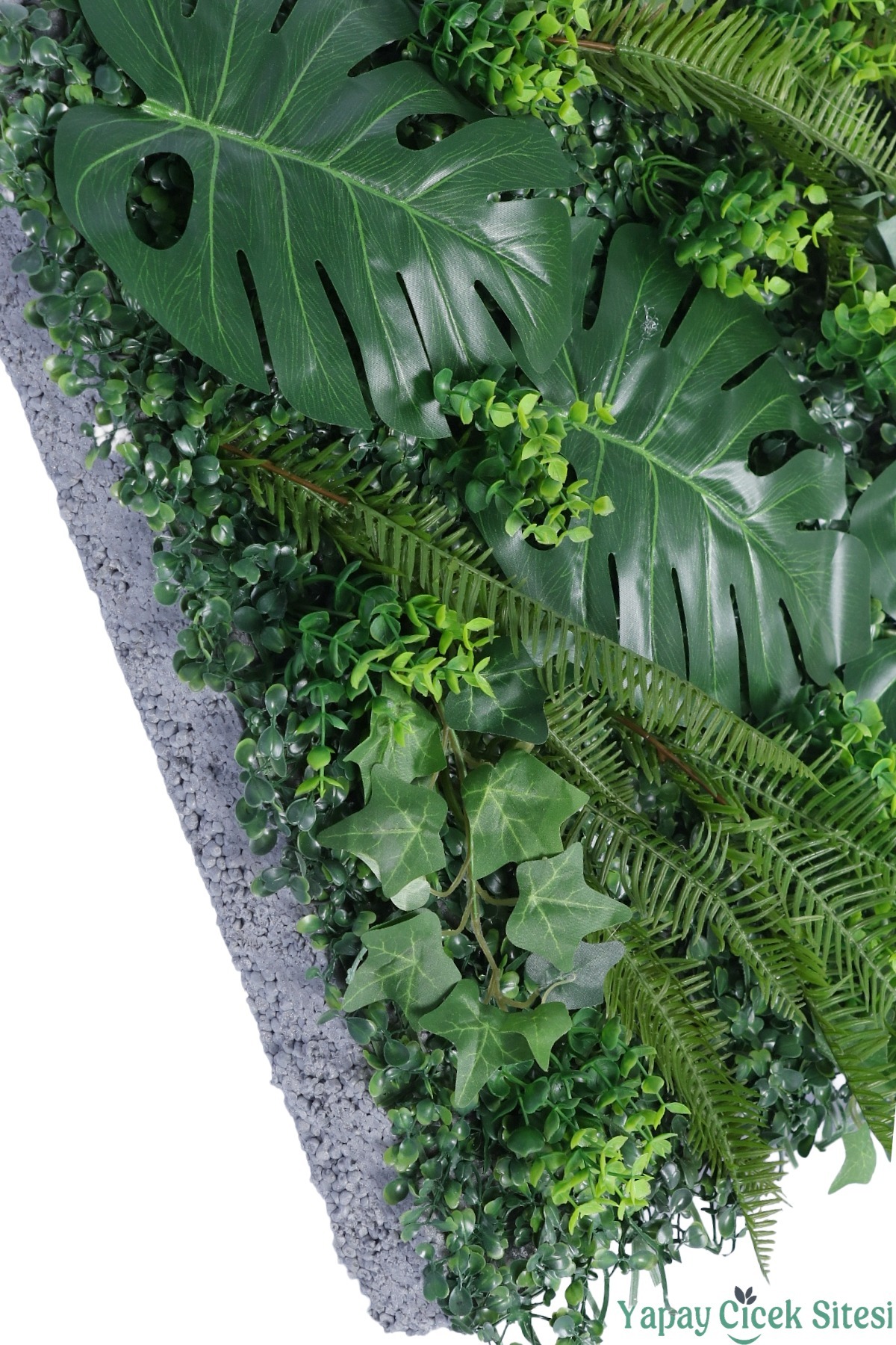 • Zengin ve Katmanlı Görünüm: 3 cm kalınlığındaki dayanıklı EPS strafor köpük üzerine titizlikle sabitlenen bitkiler, toplamda 10 cm'lik bir derinlik oluşturur. Bu hacimli yapı, sıradan düz panellere göre çok daha gerçekçi ve premium bir görünüm sunar.